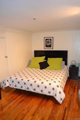 The bedroom provides a queen size bed, a dresser, a closet and a window facing the street.