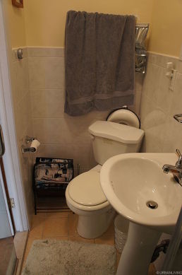 Next to the bedroom you can find the first tiled bathroom that has a bathtub with shower, a toilet and a sink.