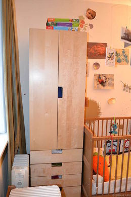 The open kitchen leads you to another hallway which gives access to the second full tiled bathroom equipped with a separate shower, a toilet and a sink. This hallway leads you to the second bedroom that is furnished with a single size children bed and a crib bed.