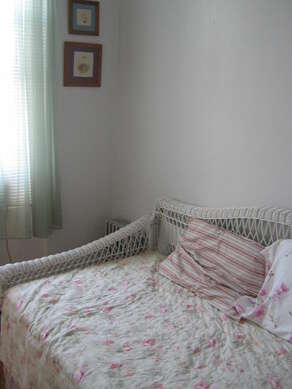 The second bedroom offers a queen size bed, an AC and a desk with a chair.