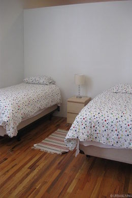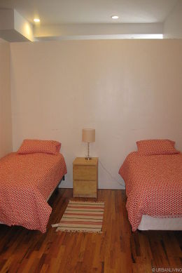The third bedroom has two single size bed, a bedside table and a dresser. There is also a window.