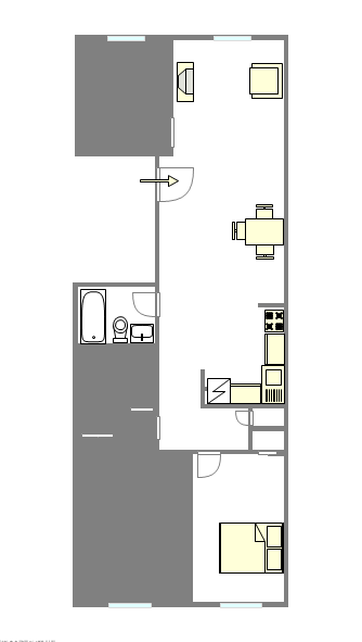The entrance door opens up into the spacious living room that provides an armchair, a TV, a closet and a dining table with three chairs.