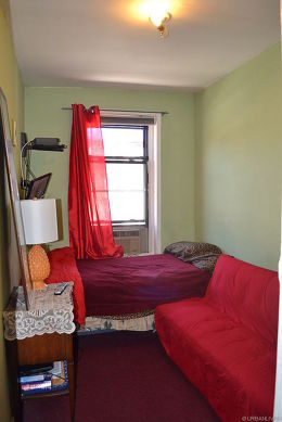 The bedroom for rent is located on the parlor floor and provides a single size bed, a closet, a dresser and a TV. Also, it has carpeting floors and a window overlooking the backyard.