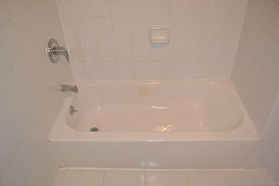 The bathroom features a shower in tub, a tub, a cabinet and a toilet.