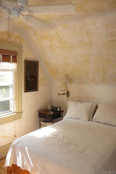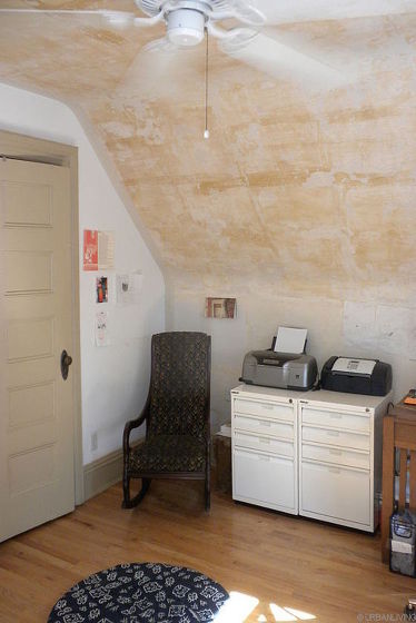 The fifth bedroom features a single size bed and a desk with chair. There are two windows and the ceilings are beveled.