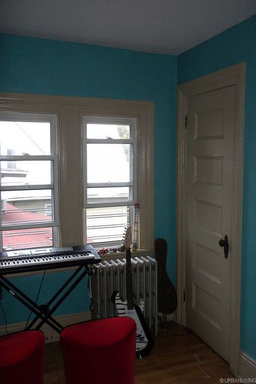 The fourth bedroom used as a music room features a full size sofabed and an electronic piano. There is a long curtain to replace the bedroom door. There are also two windows.