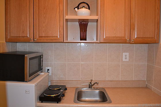 The entrance door opens up into the opened kitchen fully furnished with a microwave, a refrigerator with freezer and a hot plat.