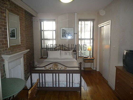 You enter the space through the livingroom area facing the full size bed with a dresser, a TV . There is also a dining table with 2 chairs. The room has two windows are facing the courtyard