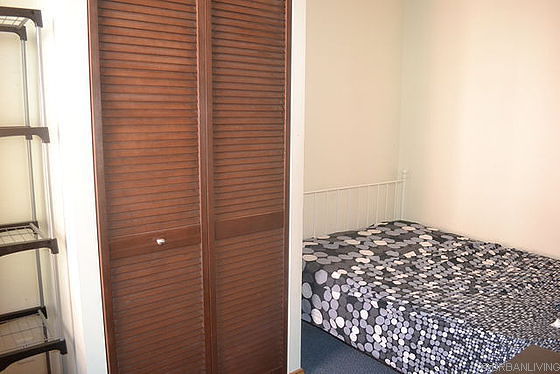 Both bedrooms have carpeting floors, a double size bed and a closet. The first room overlooks a shaft, and the second bedroom faces the backyard.