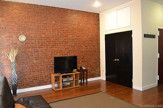 The entrance door opens up into the living room that provides two futons, one closet and a TV. It has wood floors and three windows overlooking the Lenox Avenue.