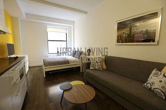 This is a fully furnished studio located on the eleventh floor of a luxury full time doorman building with elevator, gym, laundry and bike room .