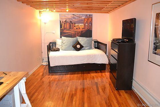 This is a fully furnished one bedroom/three alcoves/two and half bathrooms duplex apartment located on the first floor of a walk up building in Carroll Gardens.