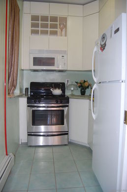 The separate kitchen is fully equipped with a stove, an oven, a sink and a refrigerator/freezer. There is all cookware available and a window facing the wall of the neighboring building.