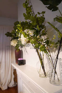 The living room, enlightened by two large windows with a high ceiling and a decorative fireplace, includes an armchair, a sofa and a coffee table. There is also a closet and a beside table.