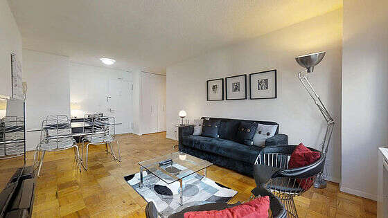 This spacious fully furnished 1BR/1BA apartment is located in a luxurious building with spectacular views in a central location of Midtown West.