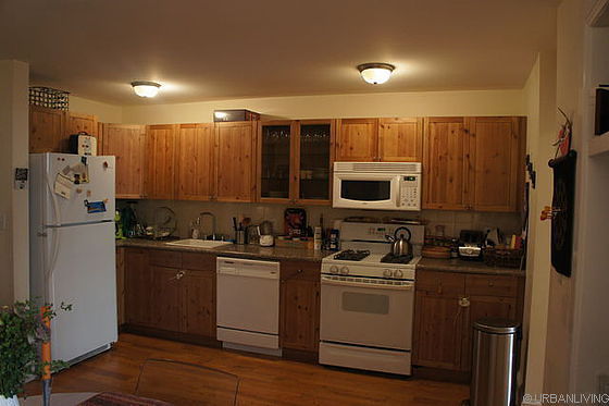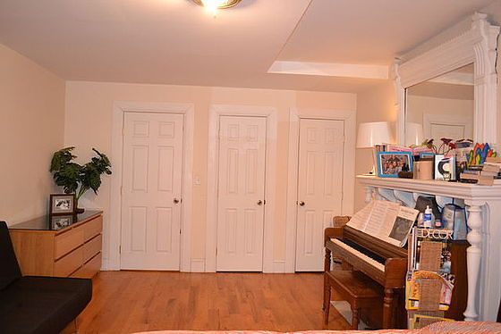 You enter the premises through a hallway that leads you on the right, to the first bedroom that is furnished with a king size bed, a queen size futon, a desk with a chair, a dresser and a piano. It has wood floors and a window overlooking the street.