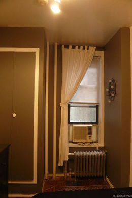The third bedroom is furnished with a double size bed, a dresser and a closet. It has wood floors and a window overlooking the court yard.