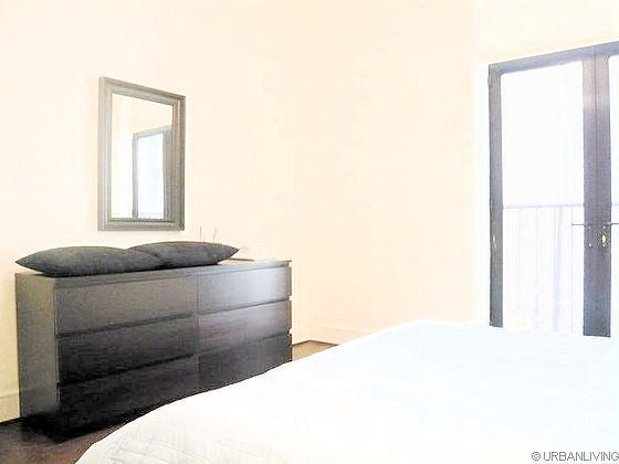 And then, there is the last bedroom, overlooking the avenue too with a queen sized bed, bedside tables, a dresser and a closet. The bathroom has tiled floors, a toilet, a shower and a sink.