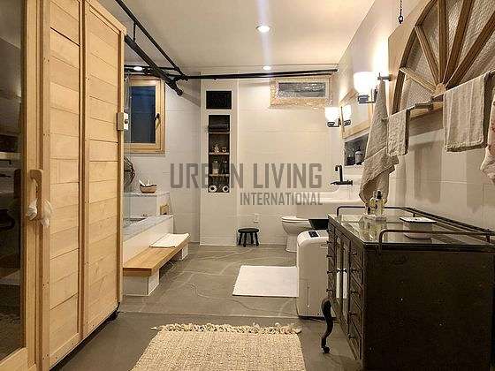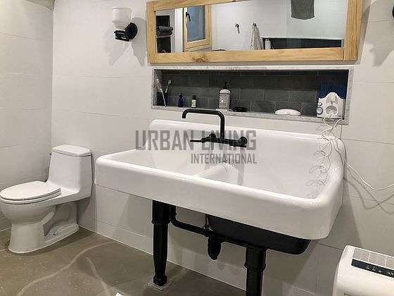 You enter this alcove on your right after few stairs. The bedroom has an access to the washing machine which is not accessible for the tenant. This room is about 350 square feet, has a small window facing the back yard, has tiled floors and is fully furnished with a closet, a queen size bed, a coffee table, a sofa and a table with four chairs. The private fully tiled bathroom is featured with a separate shower, a sink and a toilet.