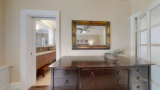 Two of the bedrooms are on the back of the apartment and share a full and roomy bath with separate shower and tub. The third bedroom is on the front and adjacent to the dressing area with a second bath. The apartment finishes and decor truly make this home inviting – warm wood floors, high ceilings, wash/dry in unit, custom paint colors, and furnishings thoughtfully chosen for soothing neutrals with pops of color.