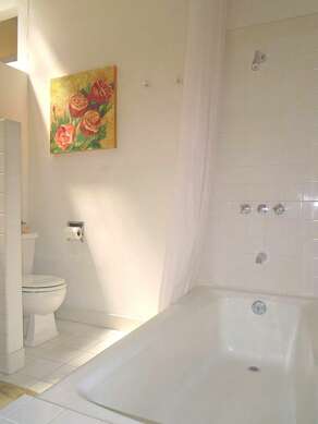 At the back of the kitchen, a hallway leads to the bedrooms and bathrooms. The first bathroom, located on the right, is fully tiled and comes with a separate shower, sink, and toilet. On the left, you’ll find the first bedroom, featuring wooden floors, a closet, a queen-sized bed, and an armchair. This bedroom has its own private bathroom with a bathtub, shower, sink, and toilet.