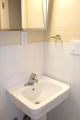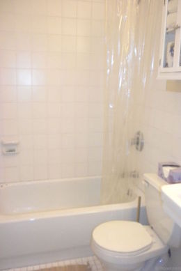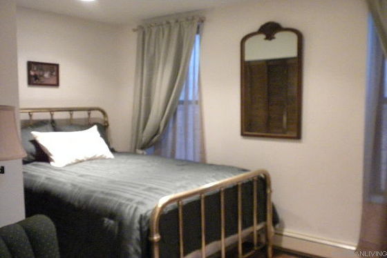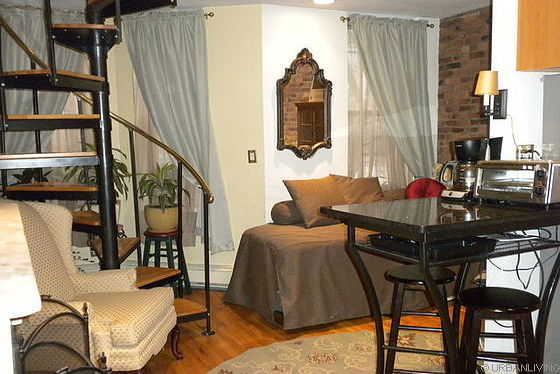 The entrance door opens up into a living room with hardwood floors which features a single size pull out bed, a coffee table, cable TV, wireless Internet. There are 3 windows facing the street.