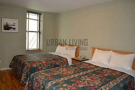 You enter the space through the livingroom area facing the full size bed with a dresser, a TV . There is also a dining table with 2 chairs. The room has two windows are facing the courtyard