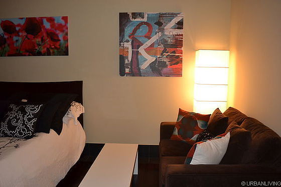 The living room offers a queen size bed, a closet, a sofa, a coffee table, a bedside table, a dresser and a TV.