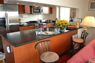 The residence features a modern open kitchen equipped with custom cabinetry, including a stove, an oven, a microwave oven and a refrigerator with freezing compartment.