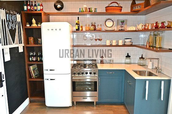 The living room features a sofa and wholechair, a shelves, a table with 4 chairs and an open kitchen which is fully furnished with high end appliances (diswasher, microwave, esspresso machine, smeg refridgerators & stoves, etc).