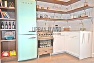 The living room features a sofa and wholechair, a shelves, a table with 4 chairs and an open kitchen which is fully furnished with high end appliances (diswasher, microwave, esspresso machine, smeg refridgerators & stoves, etc).