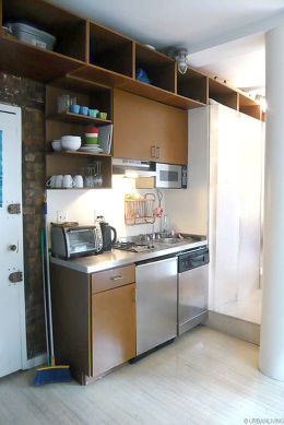 This is a one bedroom apartment. The door of the bedroom has been removed and replaced by curtains.
