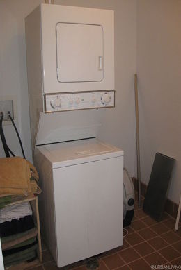 There are three large walk-in closets in the apartment. One of them has a washer and dryer.