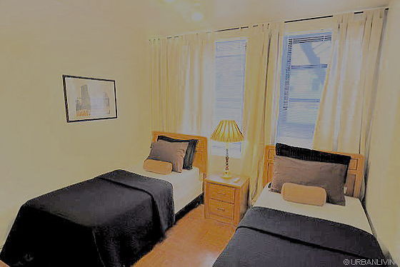 Next to the living room on the right are located the two bedrooms. The first bedroom has two twin beds, a bedside table and a closet. And the second bedroom features a Queen size bed. They are both facing the street.