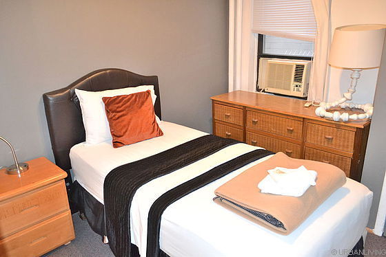 The second bedroom is furnished with a single size bed, two dressers and a closet. It has a window overlooking the court yard.