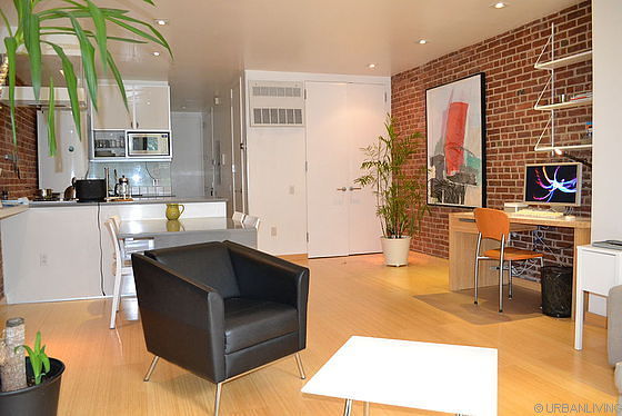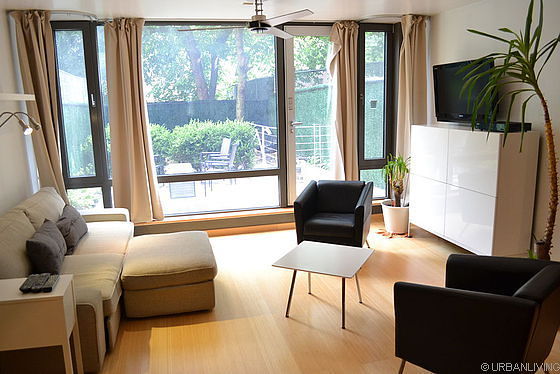 The living room which has bamboo floors, a brick wall and which is furnished with a dining table and 4 chairs, a desk with a Mac computer, a sofa, a sofabed and 2 armchairs, a TV, a DVD player, a big closet and one big window overlooking the 300 sqf garden.