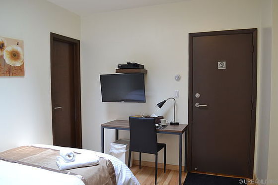 You enter the apartment into the living room that offers a queen size bed, a dining table and a TV.