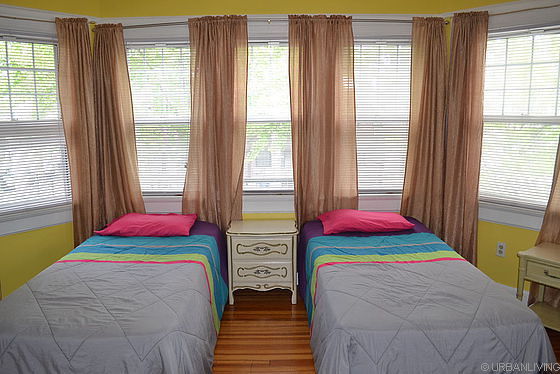 This bright wooden floored bedroom for rent features two single size bed, a desk with one chair, a dresser, a TV and 6 windows. It also has a ceiling fan.