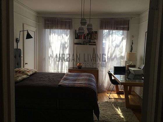 The living room leads you to the first bedroom that is furnished with a double size futon, an armchair, a desk with a chair, a decorative fireplace, and a TV. This room has wood floors and windows overlooking the street.