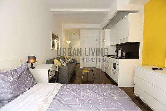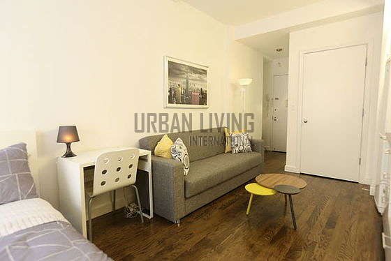 This is a fully furnished studio located on the eleventh floor of a luxury full time doorman building with elevator, gym, laundry and bike room .