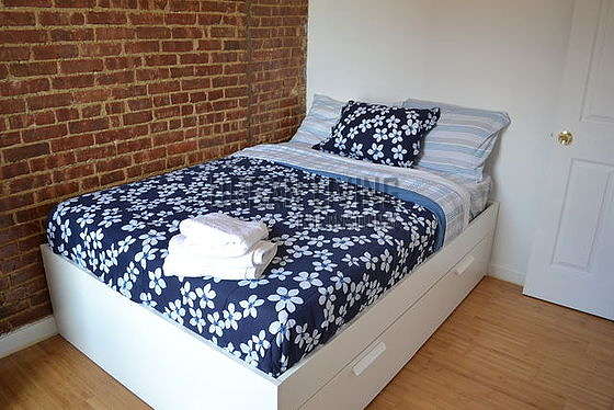 The first bedroom offers a queen size bed, a dresser and a window overlooking the neighboring building.