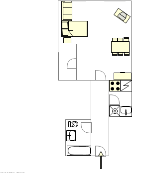 The living room equipped hardwood floors is enlightened with large windows and a number of recessed lights, as well as a double size bed , a sofa and a TV. There is also a dining table with 4 chairs.