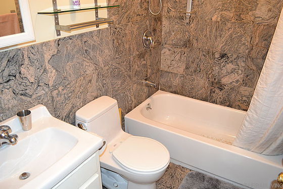 There are 2 bathrooms, one is ensuite from the master bedroom. Each bathroom has a bathtub with shower, a sink and a toilet.