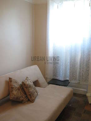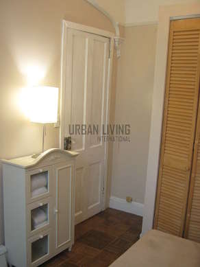 The second bedroom which is next to the first, provides a sofa bed, a closet and a bedside table. The bedroom has, hardwood floors and a window facing the garden.