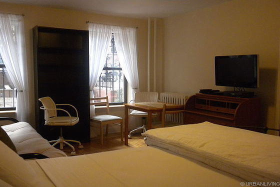 The entrance door opens to the fully furnished living room which has a sofa, a TV with cable, a dining table, four chairs, a bookcase, two bedside table and a queen sized bed. That room has hardwood floors, a closet, and windows facing the street.