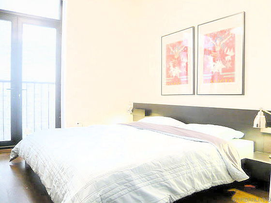 And then, there is the last bedroom, overlooking the avenue too with a queen sized bed, bedside tables, a dresser and a closet. The bathroom has tiled floors, a toilet, a shower and a sink.