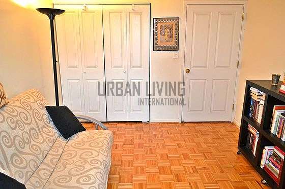 The apartment with hardwood floors throughout, features a bedroom offering a comfortable full size sofa bed, a desk, a bookcases and a large closet.