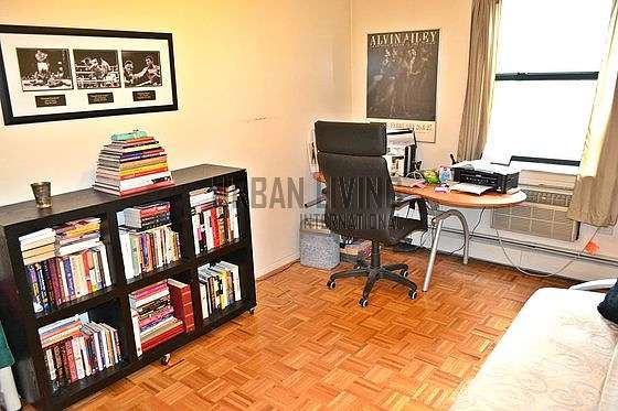 The apartment with hardwood floors throughout, features a bedroom offering a comfortable full size sofa bed, a desk, a bookcases and a large closet.
