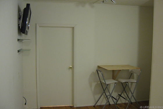 You enter the premises in the living room, where there are a TV, cofee table and air conditioning.