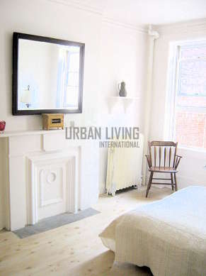 About 855 square feet, this 3 bedroom/ 1 Bathroom apartment is on the second floor of the building. The entrance door opens up into the hallway leading to the dining room. It has a table, a dresser and four chairs. Across the dining room the door gives you access to the living room. This fully furnished living room has hardwood floors, two windows and is equipped with a sofa, two armchairs and a flat screen TV with cable.